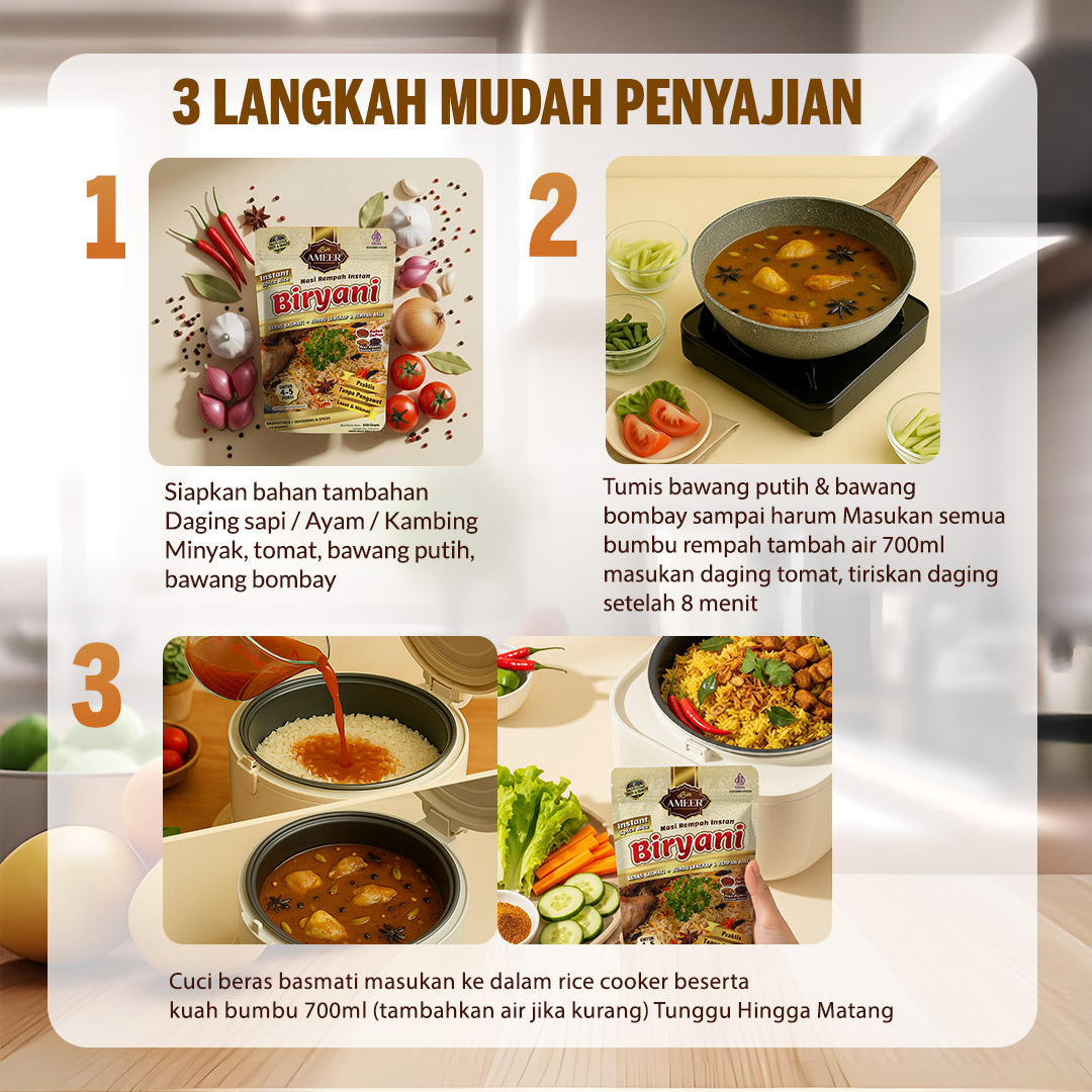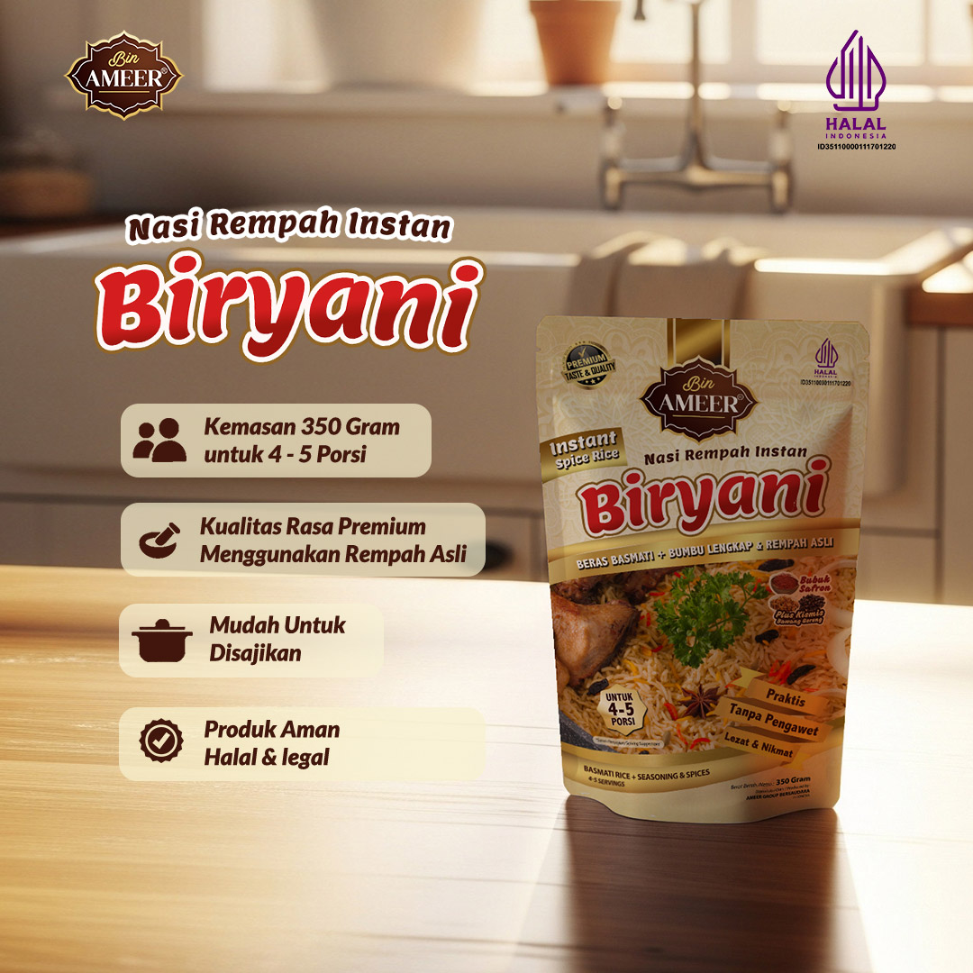 Alhamdulillah dengan Nasi Biryani Instan Bin Ameer memasak Nasi Biryani bisa dengan mudah semua orang lakukan didapur sendiri karena cara masaknya yang mudah dan simple.