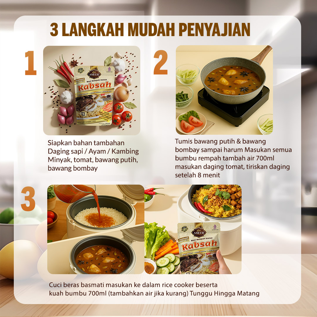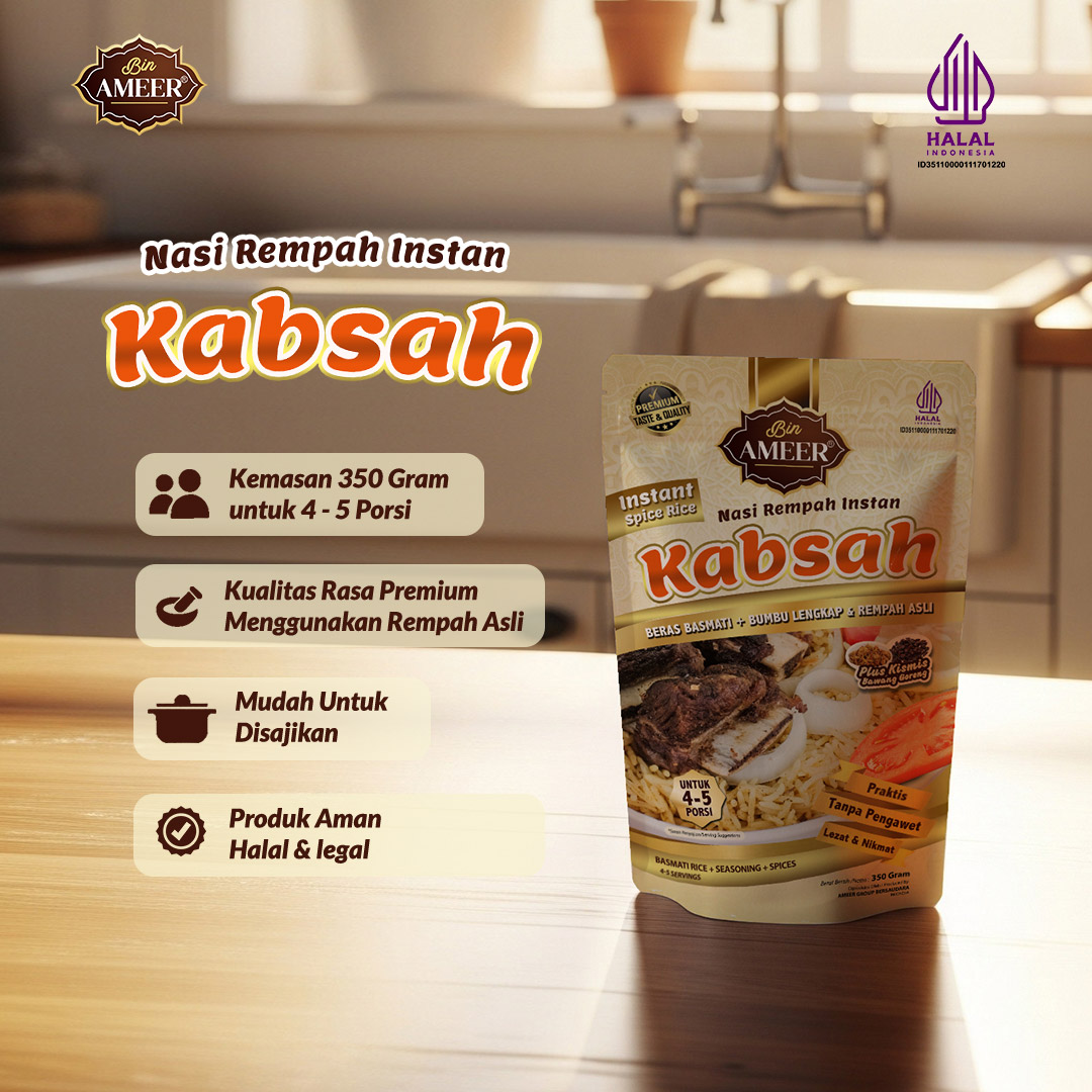 Memasak Nasi Kabsah Insyaa Allah kini mudah dan bisa semua orang lakukan didapur sendiri karena dengan Nasi Kabsah Instan Bin Ameer cara memasaknya yang mudah dan simple menjadikan memasak Nasi Kabsah tidak lagi ribet, dan Maasyaa Allah rasanya Ajiib.
